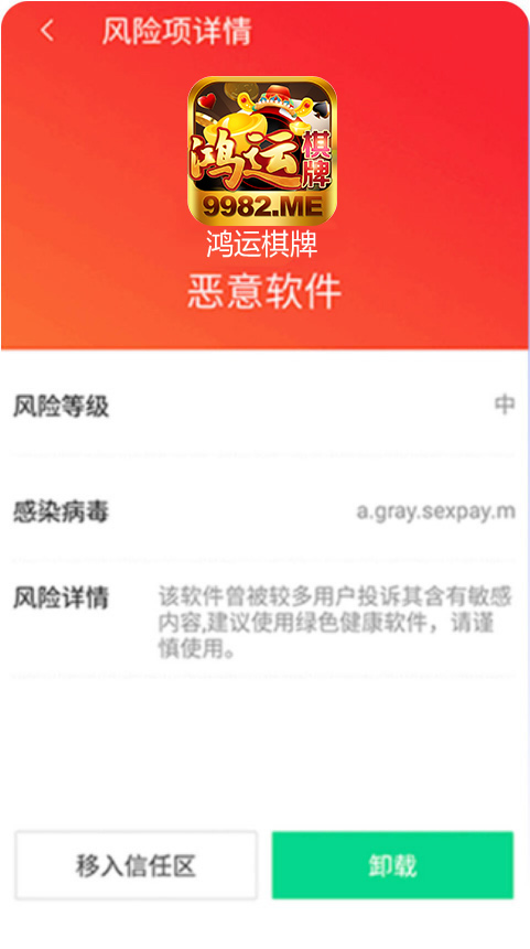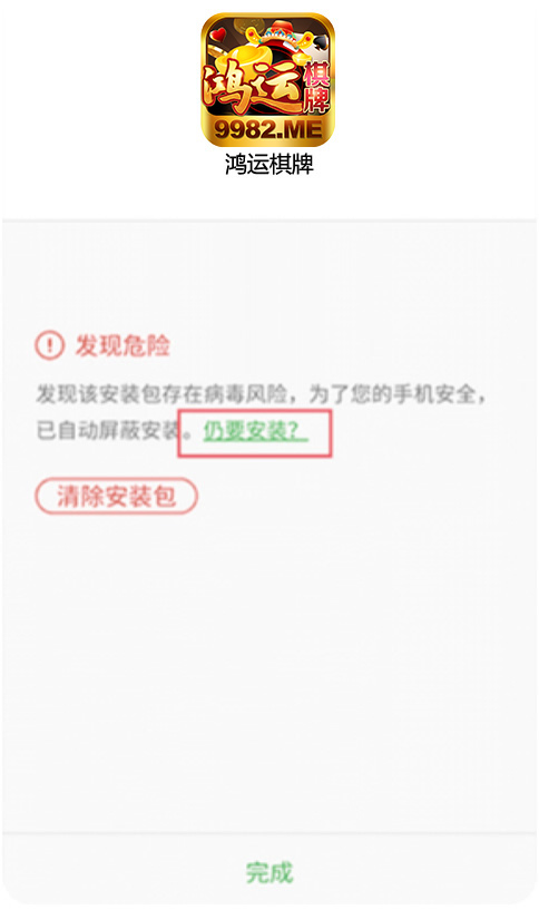 下载后会弹出「发现危险」请不用担心,鸿运棋牌没有任何病毒,请点击「仍要安装」
